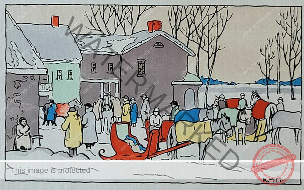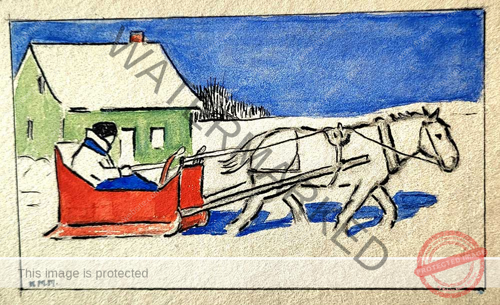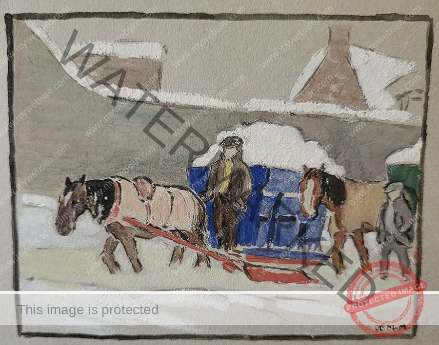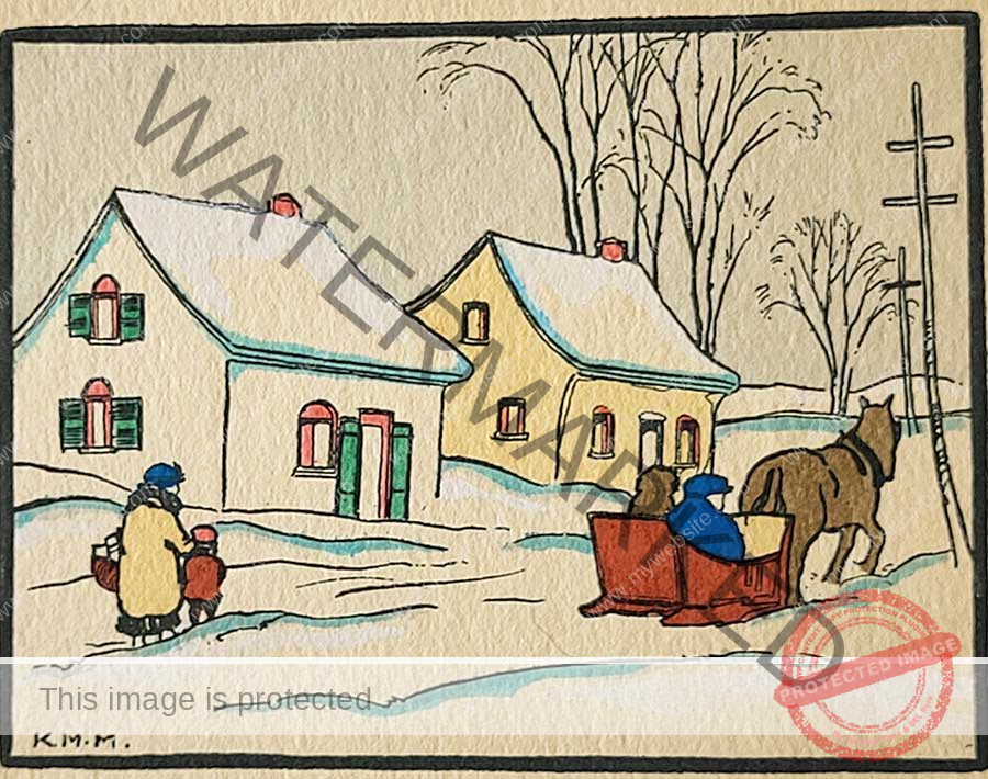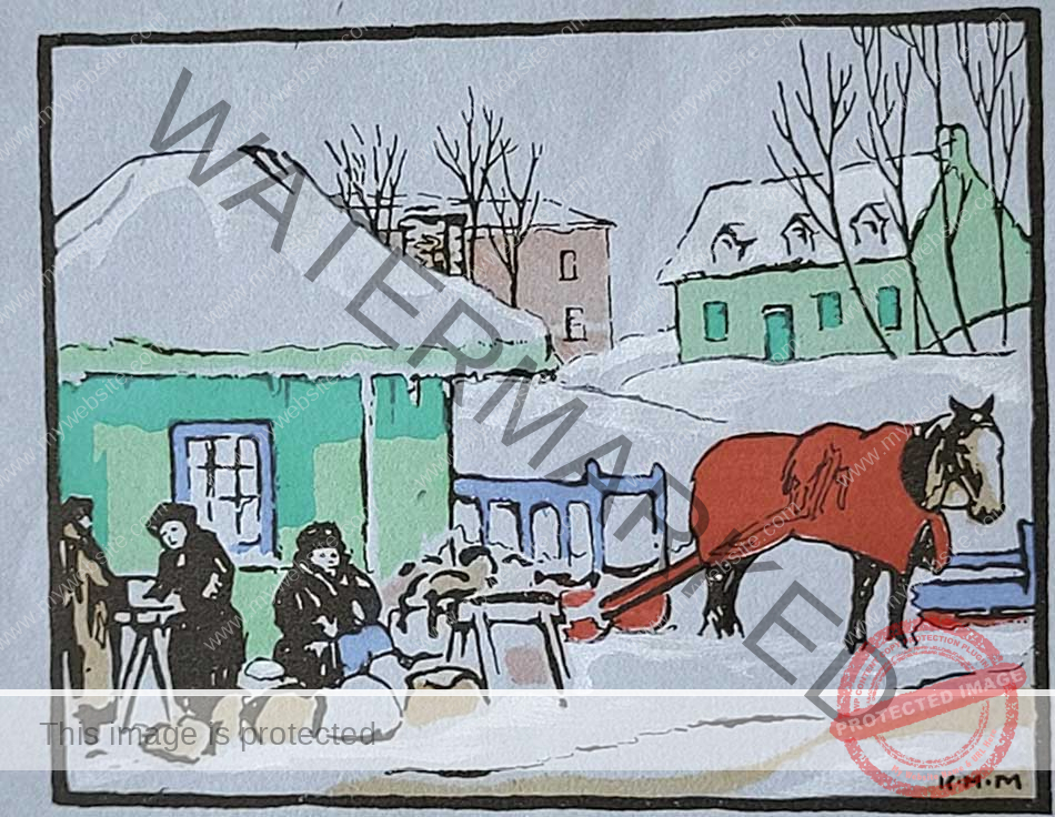 The theme here replicates Katheen’s well-known After Mass at Berthiéville with its colourful horse blankets, sleighs parked in front of the church and the congregation emerging.