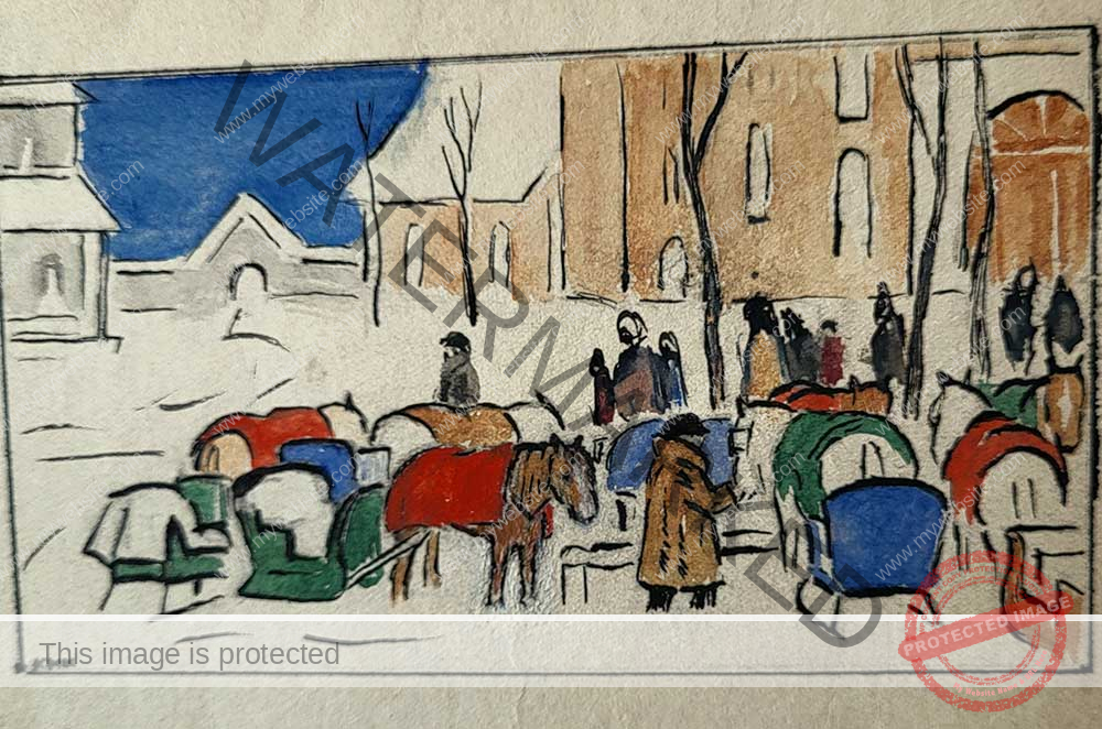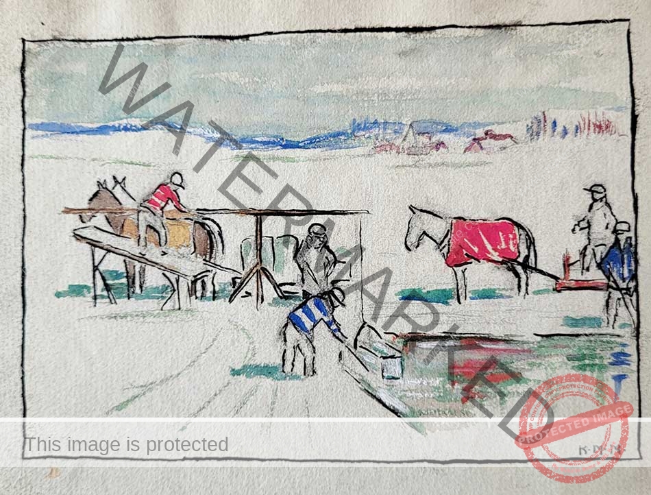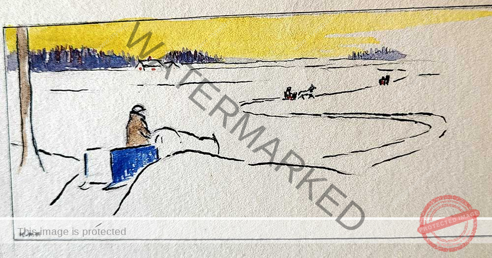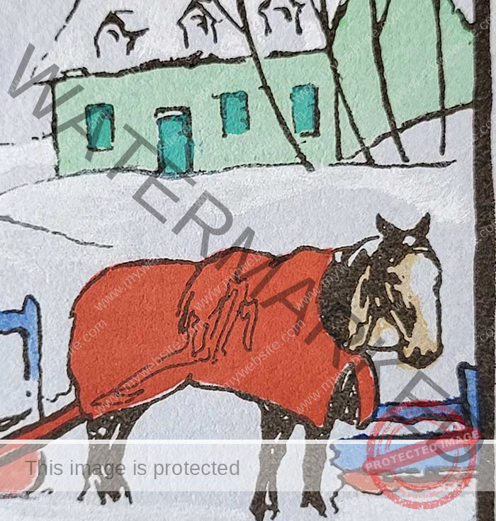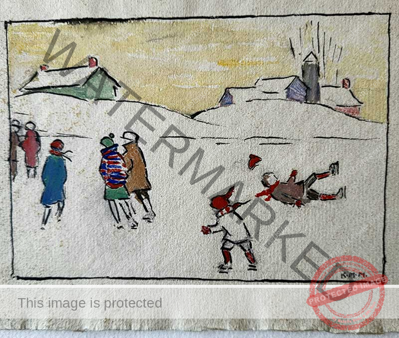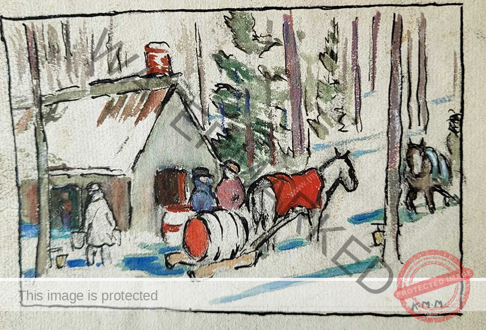 The theme here replicates Katheen’s well-known After Mass at Berthiéville with its colourful horse blankets, sleighs parked in front of the church and the congregation emerging.