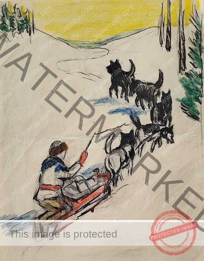 What do you suppose this habitant is transporting in his sleigh being pulled to an infinite horizon by five dogs?